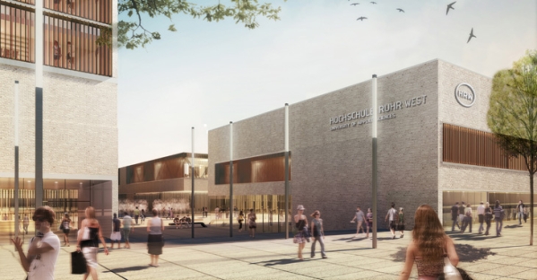 Münster, 26. Januar 2015: Die Hochschule Ruhr West wird den neuen Campus in Mülheim an der Ruhr zum Sommersemester 2016 in Betrieb nehmen können. Das teilte der zuständige Bau- und Liegenschaftsbetrieb NRW (BLB NRW) im Rahmen der turnusmäßigen Lenkungsgruppensitzung am 21. Januar 2015 mit. Ursprünglich war eine Fertigstellung zum Wintersemester 2015/16 geplant. Die zeitliche Verzögerung beim Bauablauf ist durch Vergabebeschwerden entstanden. Der geplante Kostenrahmen in Höhe von 139 Millionen Euro wird dennoch eingehalten werden.
