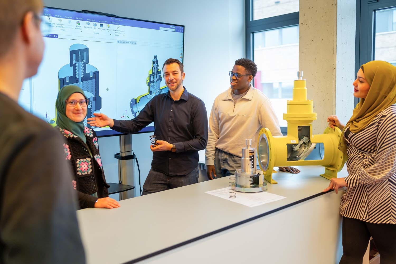 Studierende diskutieren in einer Lehrsituation über technische Modelle; im Hintergrund läuft eine Präsentation mit 3D-Grafiken.